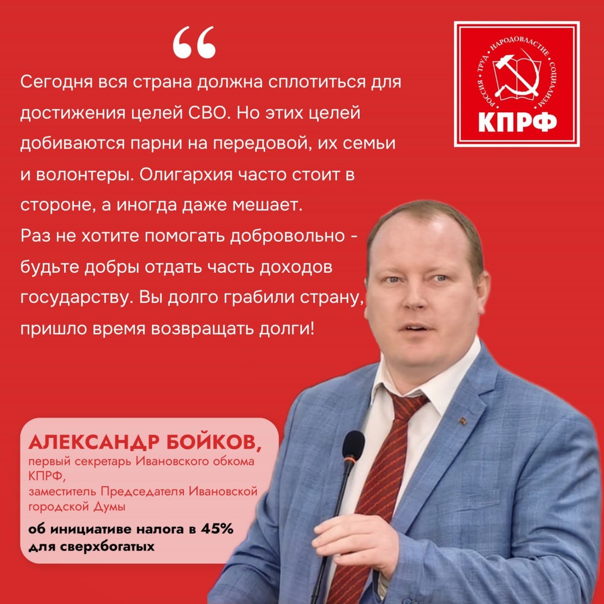 ». Ивановские коммунисты - об инициативе налога в 45% для сверхбогатых В Государственную Думу внесен новый законопроект от фракции КПРФ, направленный на радикальное перераспределение налоговой нагрузки. Инициатива, представленная под руководством первого заместителя председателя ЦК партии Юрия Афонина, предлагает значительное повышение налога для сверхдоходов и введение льготы для низкооплачиваемых граждан. Об этом пишет "Федеральный Бизнес-журнал". Согласно проекту: Для граждан с годовым доходом свыше 50 миллионов рублей ставка НДФЛ может быть повышена до 45%. Для лиц, чей годовой заработок ниже 500 тысяч рублей, ставка предлагается на уровне 10%. Для остальных категорий сохраняются текущие ставки: 13% (доход от 500 тыс. до 2,4 млн рублей) и 15% (от 2,4 до 5 млн рублей). Важно, что изменения предлагается распространить не только на трудовые доходы, но и на инвестиционные поступления, криптовалютный майнинг и различные выигрыши. Аргументация: борьба с неравенством и "сглаженной"