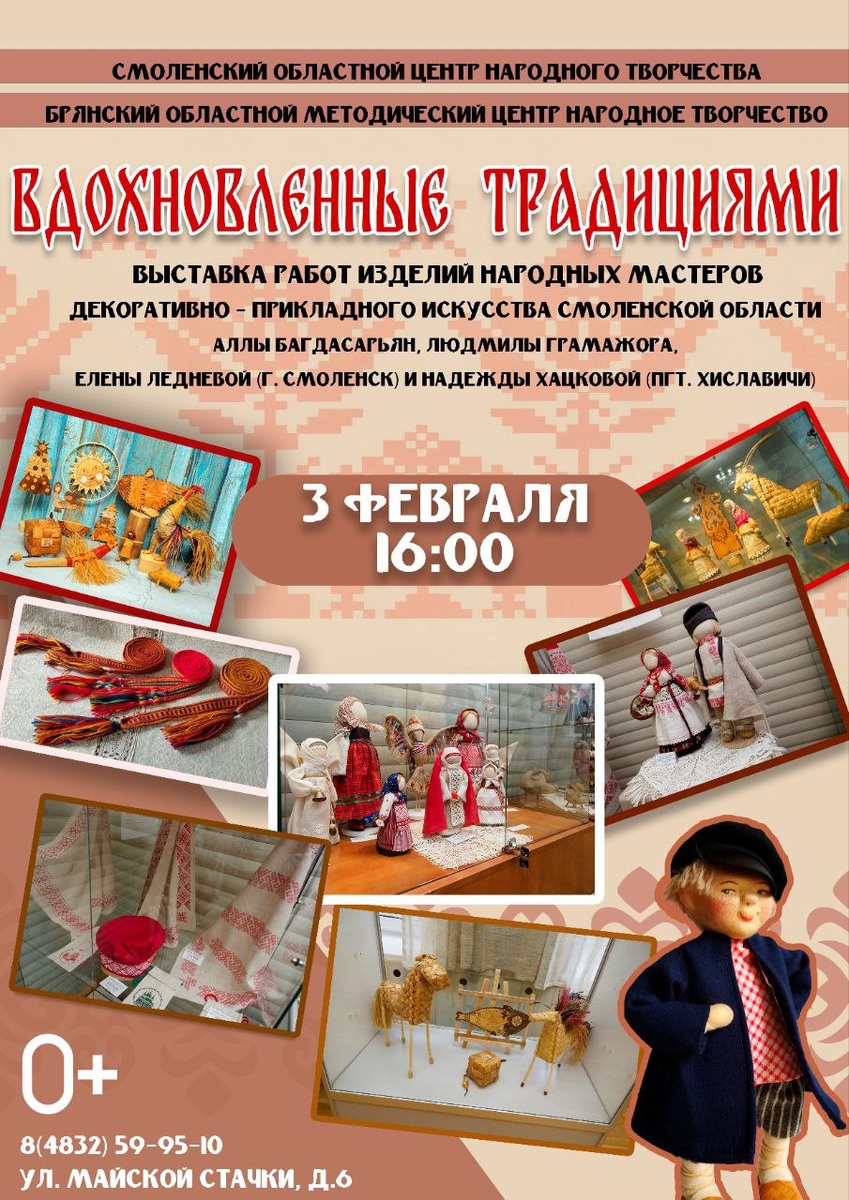 ! 🖼3 февраля в 16:00 в Брянском центре "Народное творчество" откроется выставка работ народных мастеров декоративно-прикладного искусства Смоленской области «Вдохновленные традициями». Свои уникальные работы представят: Алла Багдасарьян, Людмила Грамажора, Елена Леднева из Смоленска и Надежда Хацкова из Хиславичей. Что ждет гостей? 🔹️ узорная набойка и ткачество; 🔸️ народные и авторские куклы; 🔹️ берестяные изделия; 🔸️ керамика и многое другое. Погрузитесь в волшебный мир традиций и ремёсел вместе с нами! ❗️Выставка продлится до 26 февраля. Вход свободный 📍Адрес: г. Брянск, ул. Майской Стачки, д.6 ☎️Телефон: 8 (4832) 59-95-10 #СмоленскийЦентрНародногоТворчества