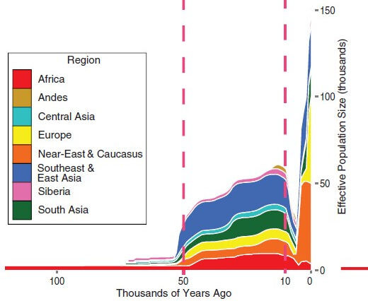 Оба графика демонстрируют экстремально низкий эффективный размер популяции, совпадающий по времени с выходом из Африки. Это первое, известное уже давно бутылочное горлышко — численность вышедших из Африки мигрантов была невелика и генетическое разнообразие тоже. В районе 50 тысяч лет наблюдается рост разнообразия, что говорит об увеличении эффективного размера популяции в период расселения по Евразии.
