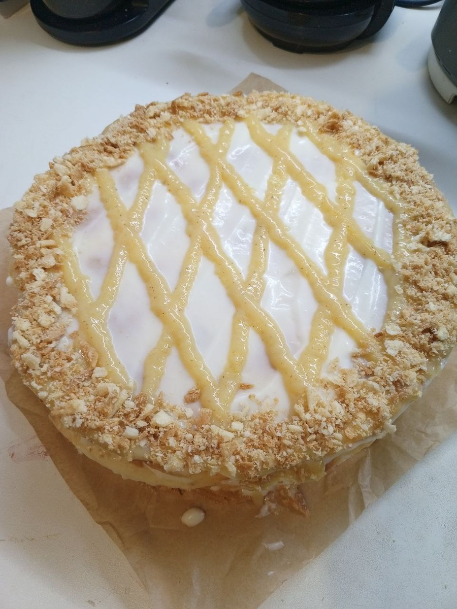 Для теста 250 г очень холодного масла растереть с 450 г муки. Я масло терла на тёрке. Яйцо смешать с 150 мл воды и 1 ст. л. уксуса 9%. + щепоть соли и ввести яйцо в мучную крошку. Долго месить не надо, только собрать тесто в комок. Разделить на 12 кусочков примерно по 75 г. Выпекать t 180* около 7 минут. Тесто при выпекании сжимается, делайте поправку на размер формы. В целом, не сложно, главное результат 💯. Крем. 2 яйца, 150 г сахара, 50 г муки, ванилин - перемешать. Влить 500 мл молока. Перемешать без комочков и варить до первых "бульков". Мешать постоянно. Добавить 100г сливочного масла после того, как снимаете с огня. Накрыть плёнкой вконтакт, оставить до полного охлаждения. После крем слегка взбить. Выкладывать на коржи крем и ягоды. У меня вишня и персики, а ещё немного лимонного курда. Кислинка лимона выгодно оттеняет сладость ягод. Готовьте с удовольствием! #готовимдомавкусно #выпечка #десерт #слоёное_тесто #заврной_крем #ягоды #торт #сливочное_масло #молоко