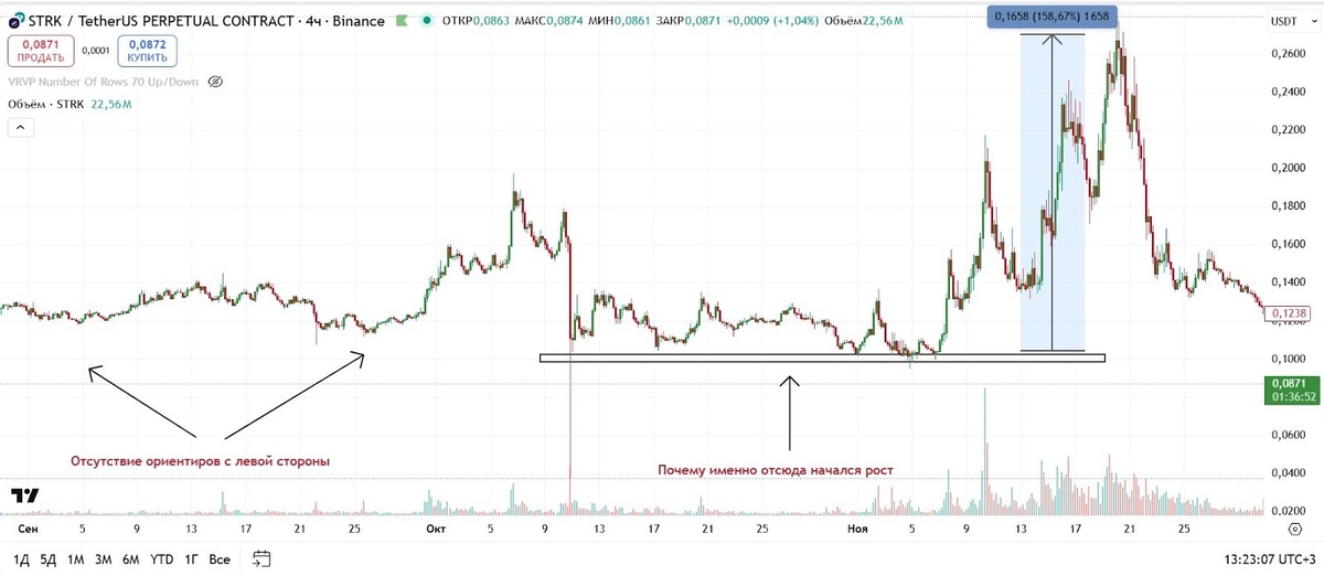 Никаких очевидных уровней, никаких круглых цифр, просто пустота на графике. А потом бац — и актив улетает на 5-10% в обратную сторону.