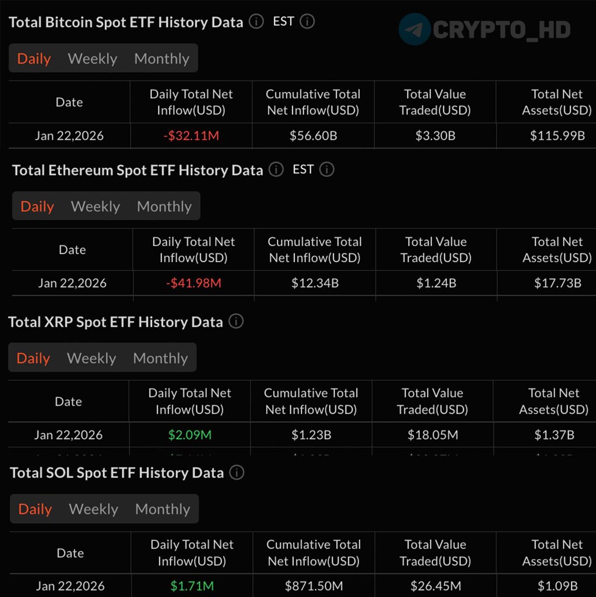 ) Финпотоки крипто-ETF за вчерашний день: ▫️#BTC = -$32,110,000. ▫️#ETH = -$41,980,000. ▫️#XRP = +$2,090,000. ▫️#SOL = +$1,710,000. ▫️#LTC, #DOGE, #LINK, #HBAR = $0. Crypto Headlines
