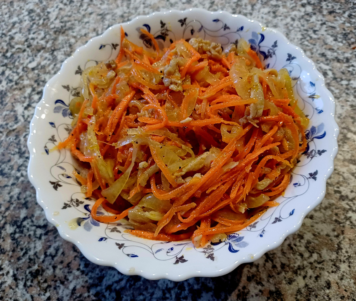 Лук почистить и нарезать тонкой соломкой.Морковь почистить и натереть на корейской терке или нарезать тонкой длинной соломкой. В глубокую посуду выложить мясо,хорошо расщепив на полоски.В сковороду налить примерно 1 ст.ложку раст.масла выложить морковь,слегка прогреть постоянно помешивая,чтобы морковь обмякла, но не поджарилась, снять с огня и выложить в посуду с мясом.То же самое проделываем с луком,прогреваем и выкладываем на морковь. Чеснок почистить (количество зубчиков будет зависеть от желаемой остроты салата).Натереть чеснок на мелкой терке и выложить кучкой на лук. Налить на сковороду растительное масло примерно 100 мл.,накалить так,чтобы над сковородой появился дымок и калёным маслом залить чеснок.Затем прибавить по вкусу соль и перец,хорошо перемешать и дать настояться салату примерно 1 час. Приятного аппетита!