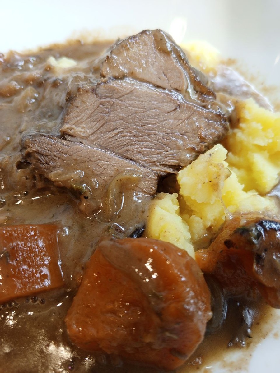 Говядина для тушения (шея, лопатка, огузок) 2 кг, нарезанная крупными кусками 4-5 см, лук репчатый — 2 шт. морковь 3-4 шт., чеснок 4-5 зубчиков, красное вино (обязательно! любое сухое) 500 мл, говяжий бульон 500 мл (или вода + 2 кубика), томатная паста 2 ст.л., мука 2 ст.л., лавровый лист, тимьян (пучок), соль, перец горошком, грибы (шампиньоны) 300 г. Обжарить мясо до лёгкой корочки. Вынуть мясо. В той же сковороде обжарить до мягкости нарезанный лук и морковь кубиками. В конце добавьте раздавленный чеснок и томатную пасту, готовить 1 минуту. Переложить к мясу. В сковороду влить вино на 2-3 минуты чтобы выпарился алкоголь. Вылить всё в мультиварку. Добавить бульон, лавровый лист, тимьян и перец горошком. Жидкость должна покрывать содержимое примерно на 2/3. Если нужно, долейте немного воды. Включаем режим "молочная каша" и томим мясо 3-4 часа. За 30-40 минут до готовности добавьте обжаренные отдельно на сливочном масле целые грибы.