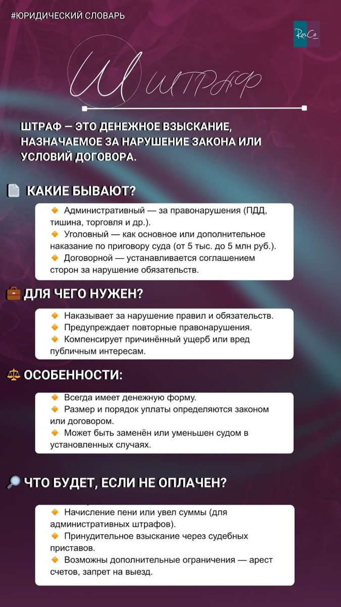 Штраф — это денежное взыскание, назначаемое за нарушение закона или условий договора. 📄 Какие бывают? 🔸 Административный — за правонарушения (ПДД, тишина, торговля и др.). 🔸 Уголовный — как основное или дополнительное наказание по приговору суда (от 5 тыс. до 5 млн руб.). 🔸 Договорной — устанавливается соглашением сторон за нарушение обязательств. 💼 Для чего нужен? 🔸 Наказывает за нарушение правил и обязательств. 🔸 Предупреждает повторные правонарушения. 🔸 Компенсирует причинённый ущерб или вред публичным интересам. ⚖️ Особенности: 🔸 Всегда имеет денежную форму. 🔸 Размер и порядок уплаты определяются законом или договором. 🔸 Может быть заменён или уменьшен судом в установленных случаях. 🔎 Что будет, если не оплатить? 🔸 Начисление пени или увел суммы (для административных штрафов). 🔸 Принудительное взыскание через судебных приставов. 🔸 Возможны дополнительные ограничения — арест счетов, запрет на выезд. 💼 RosCo в Telegram и Max