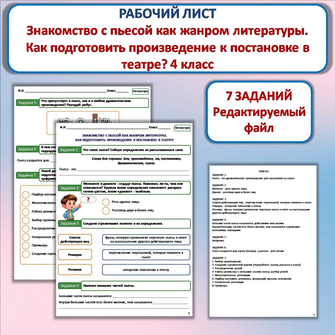 Рабочий лист скачать здесь Рабочий лист «Знакомство с пьесой как жанром литературы. Как подготовить произведение к постановке в театре?» разработан к уроку литературного чтения в 4 классе. Рабочий лист состоит из 7 заданий. Задания располагаются на первом и втором листах, ответы - на третьем листе. Учащиеся узнают (или повторят): Данная разработка облегчит работу учителю начальных классов на уроке, а также подойдет для дистанционного обучения. Содержание рабочего листа можно отредактировать и подстроить под цели вашего урока и уровень вашего класса. Рекомендую перед началом работы с данным рабочим листом ознакомить учащихся с презентацией по данной теме. Презентацию скачать здесь Желаю успеха!