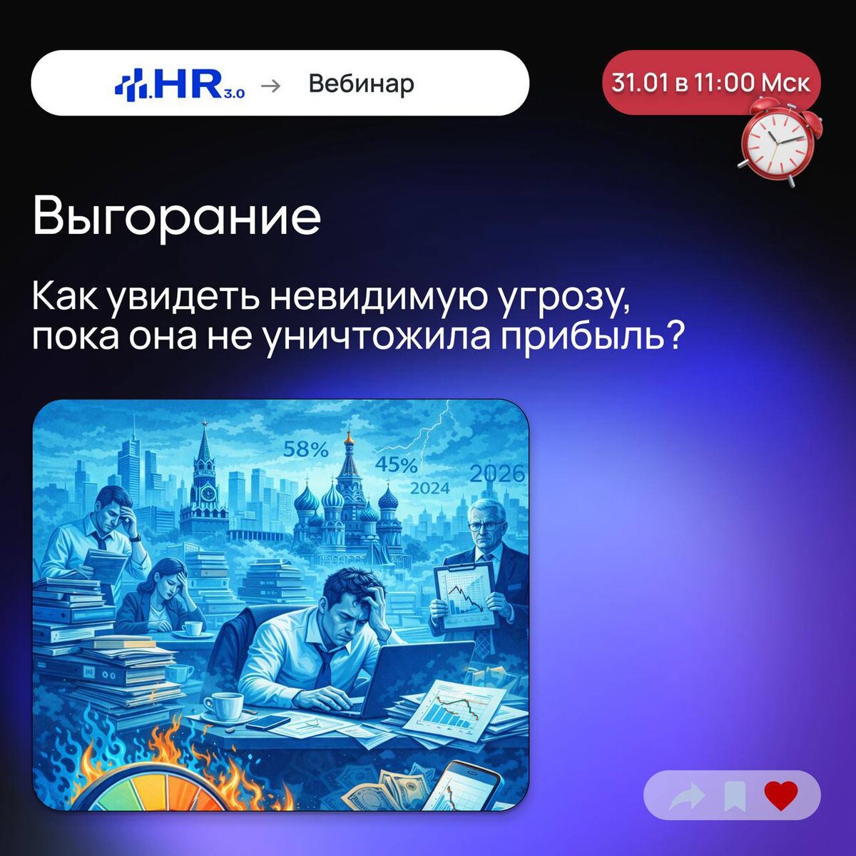 Выгорание без психологии Диагностика, границы управления, решения Выгорание сегодня не «психологическая мода», а зона объективного управленческого риска. Кризисный уровень выгорания несет прямые потери для бизнеса, для самого человека/сотрудника - потеря фокуса, уход от ответственности, качество решений падает, вовлеченность исчезает. Проблема в том, что стандартные методы не работают - это факт, иначе не было бы такой удручающей статистики. Выгоревший сотрудник будет честен в опросе eNPS? Сомнительно. Он уже циничен и просто получает ЗП. Мы предлагаем подойти к выгоранию не как к эмоциональному состоянию, а как к изменению систем мышления и поведения, которое можно «считать». Приглашаем на вебинар собственников и топ-менеджеров, и всех кому важно разобратся в данной тематике глубже. Программа вебинара: 1️⃣ Четкое определение выгорания как управленческого и профессионального риска, а не эмоционального состояния или «усталости». Фиксация границы между нормальной перегрузкой и начало