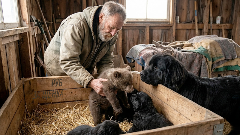 Когда Тихон заглянул в загородку к щенкам, он обомлел. Их стало восемь. Присмотревшись к «новенькому», старик ахнул: шерсть короткая, бурая, хвоста нет. Это был тот самый медвежонок из берлоги! Видимо, у собаки сработал материнский инстинкт сильнее, чем страх, и она «усыновила» сироту, почуяв его в лесу.