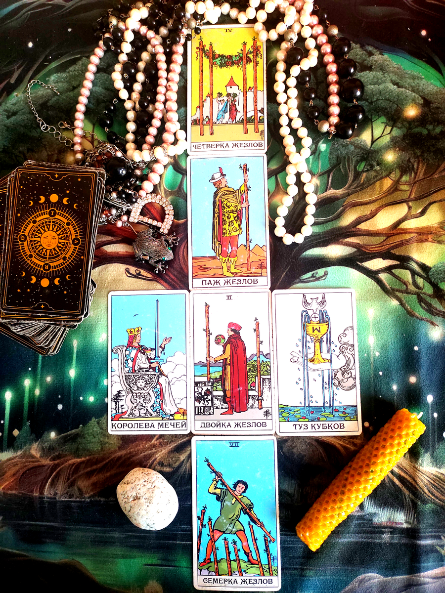 Неделя предлагает вам динамичный сценарий: от первого вдохновения и любопытства (Паж Жезлов) и обретения кратковременного покоя (4 Жезлов), через фазу ментальной ясности и взвешенного планирования (Королева Мечей, 2 Жезлов) и новых сердечных возможностей на работе (Туз Кубков), к необходимости проявить стратегическую хитрость и изобретательность (7 Мечей).