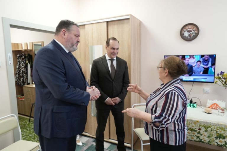 23 января в Мордовию с рабочей поездкой прибыл Министр труда и социальной защиты Российской Федерации Антон Котяков. Вместе с Главой Мордовии Артемом Здуновым он приехал в с. Кемля — в Ичалковский дом-интернет для престарелых и инвалидов. Интернат новый — введен в строй год назад, на его строительство и оснащение по национальному проекту «Демография» было направлено около 1,4 млрд рублей (1,1 млрд — средства федерального бюджета). Сейчас здесь проживают около 150 человек Министр осмотрел обустройство интерната, пообщался с проживающими пенсионерами и персоналом. В кабинете физиотерапии Антон Котяков и Артём Здунов поговорили с Натальей Никоноровой из Ичалковского района. «Здесь мне лечат артрит, — рассказала она. — Врач назначил — рука плохо поднимается. А так я еще бегаю! Как думаете — сколько мне лет? 94 года! Здесь мне лучше, чем дома. Есть с кем поговорить, и уход хороший. Я всем очень довольна». «Условия у нас прекрасные, — говорит Виктория Хлопунова из Саранска. — Все удобства. Ж