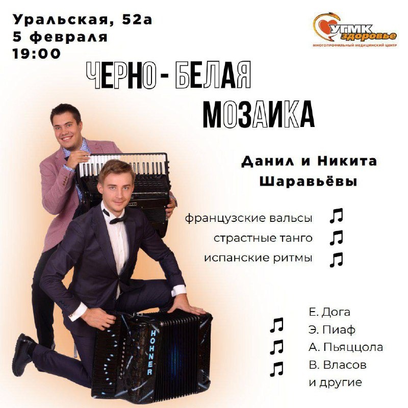 »! В программе: французские вальсы, страстные танго, испанские ритмы, произведения Евгения Дога, Эдит Пиаф, Астора Пьяццолы, Владимира Власова и других. Для вас играют: Данил и Никита Шаравьёвы — солисты «Городского дома музыки», лауреаты всероссийских и международных конкурсов 5 февраля, 18:30 ул. Уральская, 52а Билеты доступны по ссылке
