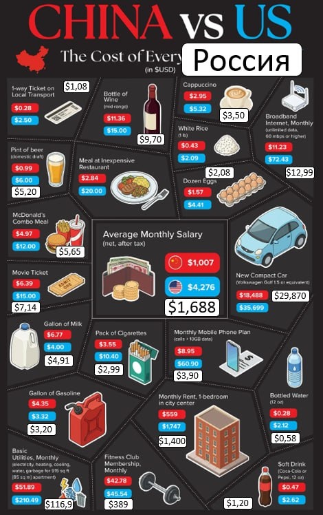 Нашёл любопытную инфографику с ценами на товары постоянного спроса: от широкополосного интернета до Биг Маков. Доработал её для нас, добавив средние цены на аналогичные услуги и товары. Средние цены в России взяты для Москвы из среднего ценового сегмента. Расчёт проводился при курсе 77 руб/$. Яйца считаются по 12 шт. Бензин и молоко в галлонах 3.785л. Меня удивило, что средняя зарплата в Китае ниже чем в России, но при этом большинство товаров, в том числе автомобили (для расчёта в России взял Haval Julio в базовой комплектации), стоит в 1,5 - 2х раза дешевле. А "грешные товары" — алкоголь и сигареты в России дешевле 😅 Особенно удивил абонемент в спорт зал на месяц. В Москве реально абонемент стоит 30т.р.? Смотрите - комментируйте)