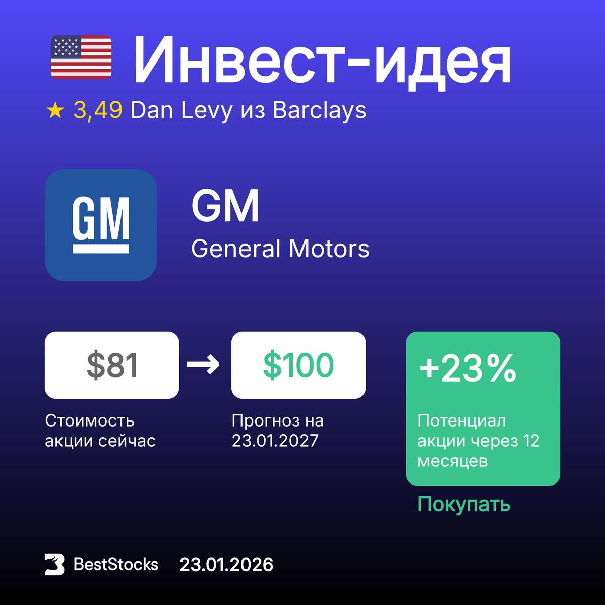 Π’ΠΈΠΊΠ΅Ρ: GM ΠΡΠΎΠ³Π½ΠΎΠ·Π½Π°Ρ ΡΠ΅Π½Π°: $100 (+23%) Π Π΅ΠΊΠΎΠΌΠ΅Π½Π΄Π°ΡΠΈΡ: ΠΠΎΠΊΡΠΏΠ°ΡΡ InvestRank Π°ΠΊΡΠΈΠΈ: 5 ΠΈΠ· 10 ΠΡΠΎΠ³Π½ΠΎΠ· ΡΠ΄Π΅Π»Π°Π½: 23.01.2026 ΠΡΠΎΠ³Π½ΠΎΠ· Π΄ΠΎ: 23.01.2027 ΠΠ½Π²Π΅ΡΡ-ΠΊΠΎΠΌΠΏΠ°Π½ΠΈΡ: Barclays ΠΠ½Π°Π»ΠΈΡΠΈΠΊ: Dan Levy ΠΡΡ ΡΠ΅ΠΊΠΎΠΌΠ΅Π½Π΄Π°ΡΠΈΠΈ Π½Π° ΡΠ΅Π³ΠΎΠ΄Π½Ρ β β’β’β’β’β’ π’π’π’ ΠΠΎΠ΄ΠΏΠΈΡΡΠ²Π°ΠΉΡΠ΅ΡΡ Π½Π° Π±Π΅ΡΠΏΠ»Π°ΡΠ½ΡΠ΅ ΠΊΠ°Π½Π°Π»Ρ BestStocks: ΠΠΈΠ²ΠΈΠ΄Π΅Π½Π΄Ρ Π ΠΎΡΡΠΈΠΈ β’ ΠΠ½Π²Π΅ΡΡ-ΠΈΠ΄Π΅ΠΈ ΠΏΠΎ Π°ΠΊΡΠΈΡΠΌ Π‘Π¨Π β’ ΠΠΈΠ²ΠΈΠ΄Π΅Π½Π΄Ρ Π‘Π¨Π