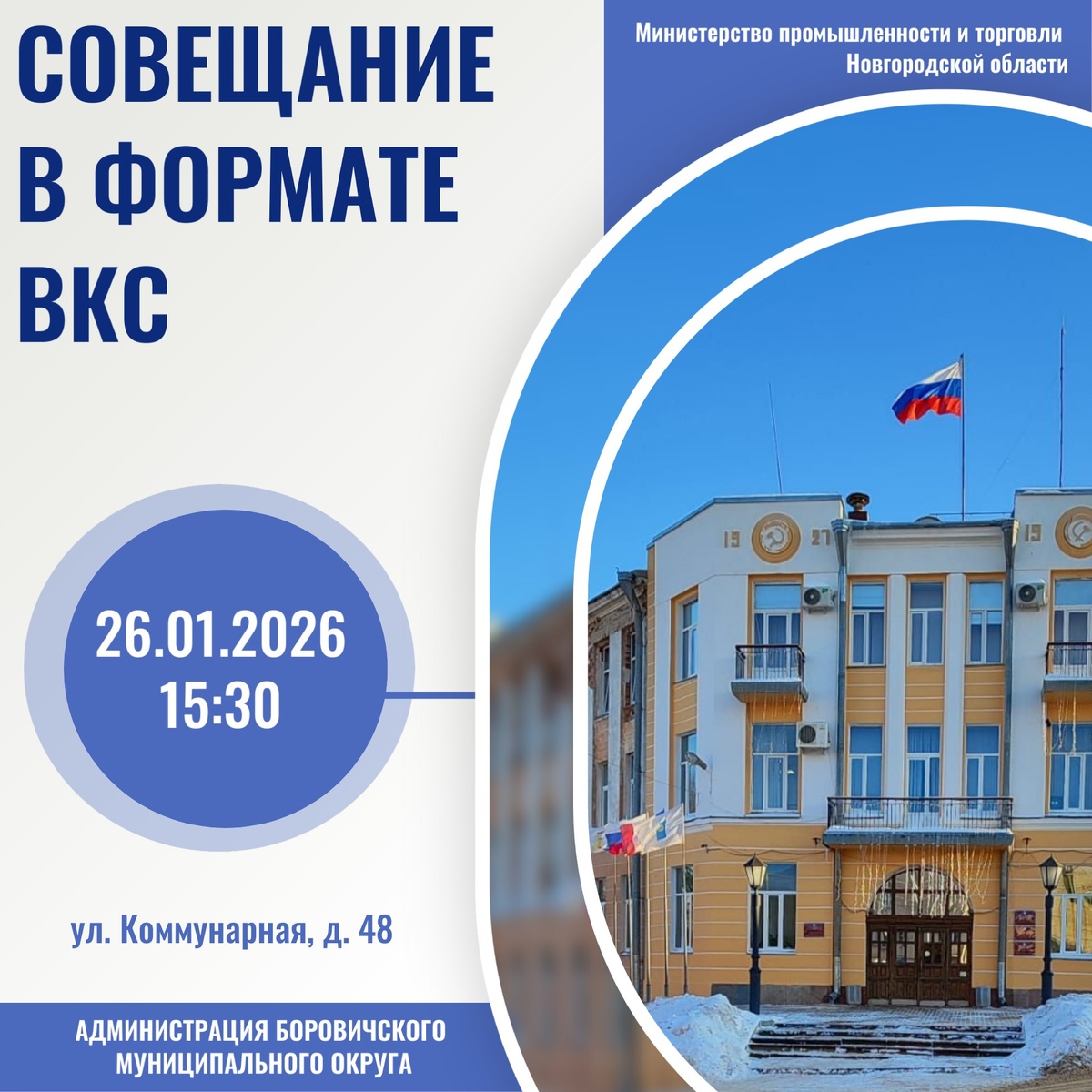 ! На базе Администрации Боровичского муниципального округа министерство промышленности и торговли Новгородской области проводит рабочее совещание в формате видео-конференц-связи (ВКС), на котором будут рассмотрены: 🔸 вопросы изменения законодательства в сфере лицензирования алкогольной и табачной продукции, 🔸 профилактические визиты, с использованием приложения «Мобильный инспектор», 🔸 обеспечения торговых объектов возможностью использования Цифрового ID MAXи функции «Госкан» в мобильном приложении «Госуслуги» для подтверждения возраста покупателя. ❗Приглашаем вас 26.01.2026 года в 15 часов 30 минут на встречу представителей несетевых торговых объектов, осуществляющих реализацию подакцизных товаров, в Администрацию Боровичского муниципального округа (кабинет 52). 📌 В случае невозможности личной явки представителя хозяйствующего субъекта направляем ссылку для подключения в индивидуальном порядке: https://clck.ru/3RRFgW.