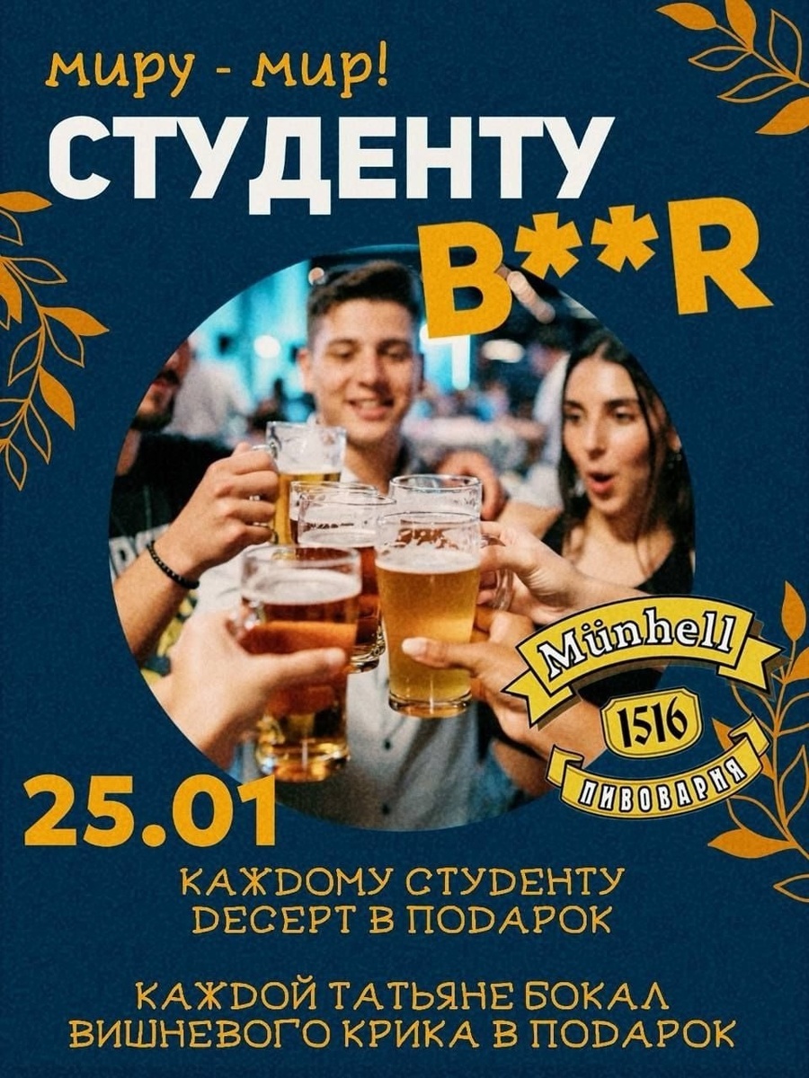 🎁 25 января, в День студента и Татьянин день, ресторан «MUNHELL» всем Татьянам дарит бокал вишневого крика. А для всех студентов в подарок вкусные десерты.