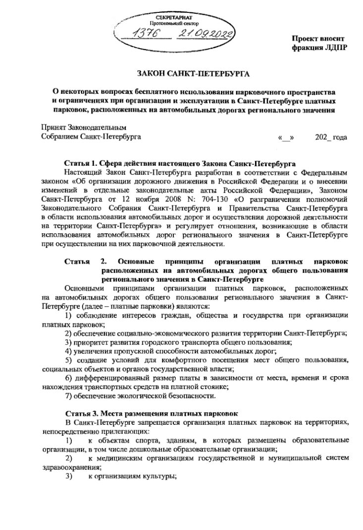 Еще в 2022 году фракция ЛДПР вносила на рассмотрение законопроект, направленный на запрет организации платных парковок на территориях, прилегающих к государственным и муниципальным медицинским организациям, к объектам спорта, зданиям, в которых размещены образовательные организации, в том числе дошкольные образовательные организации, к организациям культуры, к органам государственной власти, органам местного самоуправления в Санкт-Петербурге и организациям, предоставляющим государственные и муниципальные услуги. Вопросы платных парковок у социальных объектов неоднократно обсуждались на заседании комиссии по транспорту и развитию транспортной инфраструктуры Законодательного собрания Санкт-Петербурга, однако, углубившись в проблему, становится очевидно, что ситуация значительно сложнее, чем кажется на первый взгляд. Позиция вице-губернатора Санкт-Петербурга Кирилла Полякова ясна: внедрение бесплатных парковок у социальных учреждений может быть признано юридически рискованным, экономичес