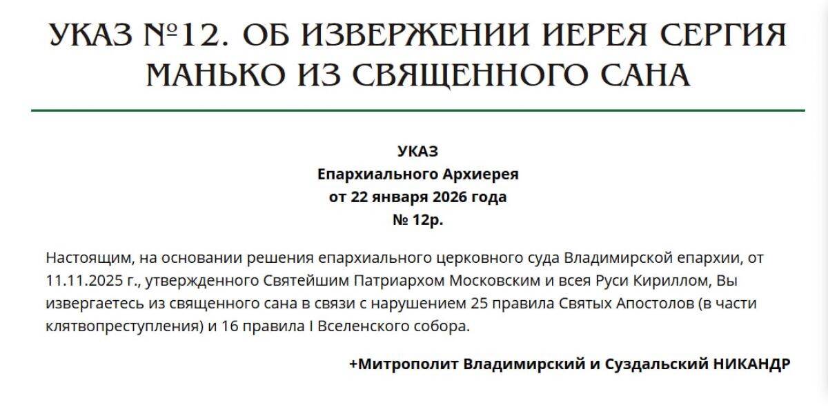 22 января 2026 года был издан Указ об извержении иерея Сергея Манько из священного сана. Это произошло на основании решения епархиального церковного суда Владимирской епархии. Напомним, экс-священнослужитель "прославился" скандальной историей. В 2022 году бывшая супруга экс-священника Елена сообщила, что её муж увлёкся алкоголем, у него появилась любовница. Она сообщила, что супруг стал вести себя агрессивно и нередко поднимает руку на неё и детей. Женщина сняла побои, написала заявление в полицию и подала на развод, однако мужчина вызвал медиков. Елену Манько против её воли госпитализировали на месяц и держали на успокоительных препаратах. Отпустили женщину только после того, как история получила общественный резонанс. Позже в суде Елене пришлось доказывать свою адекватность и бороться за опеку над детьми. С мужем-священником она всё же смогла развестись. В итоге дети остались с Еленой, а теперь уже бывшего священника мировой судья приговорил к 280 часам обязательных работ и выплате 5