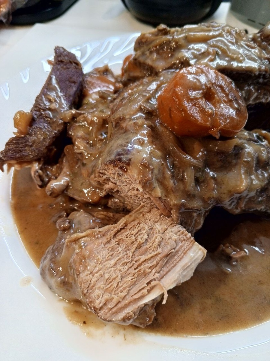Говядина Бёф Бургиньон. Я готовила говядину большим целым куском. Не резала на кусочки 4-5 см. Кусок отлично поместился в чашу мультиварки. Предварительно обжарила кусок со всех сторон до корочки, чтобы запечатать сок внутри. Далее по рецепту. После готовности мяса я слила бульон в кастрюльку, отдельно зажарила сливочное масло с мукой как для соуса бешамель. Развела масляно-мучную смесь бульоном от мяса и отправила его обратно в чашу. Таким образом у меня получилась отличная подлива, густая, насыщенная ароматами мяса, трав и овощей. Очень вкусно подавать такое мясо с подливой к картофельному пюре. В целом не сложно, просто по времени длительно. Но зато можно приготовить заранее и точно знать , что мясо абсолютно готово. Готовьте с удовольствием! #готовимдомавкусно #мясо #говядина #говядина_с_подливой #мясо_с_овощами #вино #овощи #подлива #ужин #говядина_в_мультиварке
