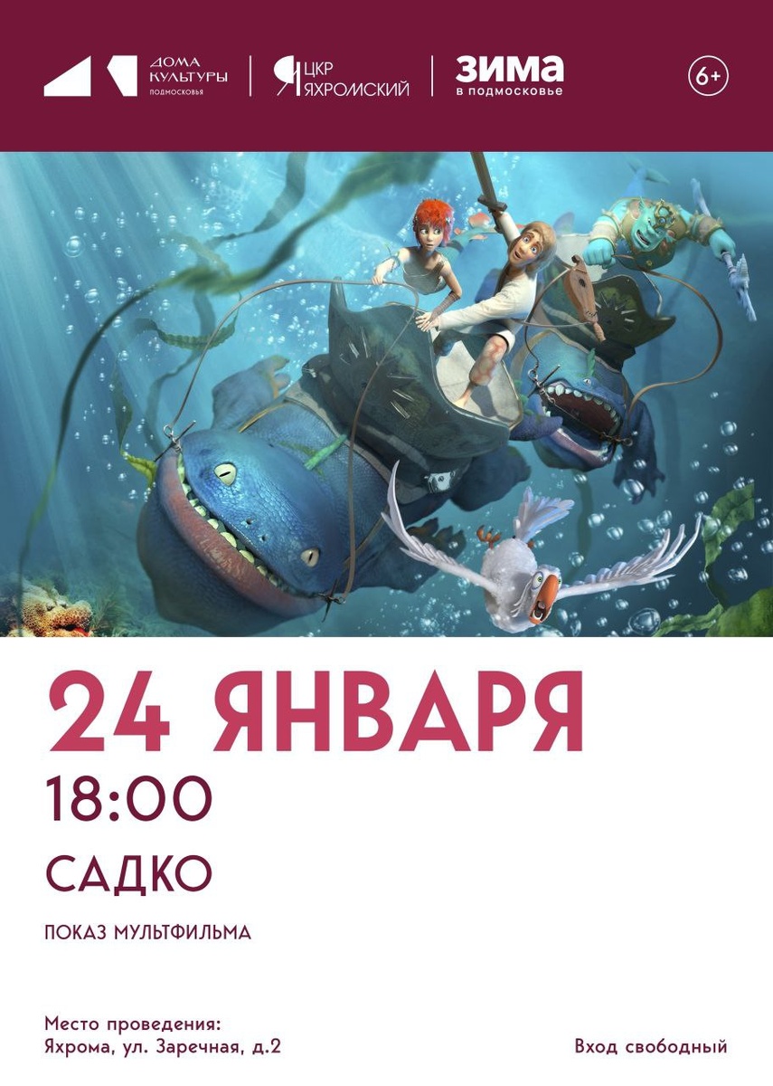 !🎬 🍿Центр культурного развития «Яхромский» приглашает на показ семейного мультфильма «Садко» Обаятельный юноша по имени Садко необыкновенно талантлив - о его игре на гуслях ходят легенды. Но только слава и признание не радуют Садко, на его сердце печаль - он не знает любви, только слышал о ней. Ради этого неизведанного и прекрасного чувства он готов отказаться даже от своего таланта. И судьба принимает вызов юноши: он должен отправиться на дно морское, чтобы найти свою любовь. Бесстрашный юноша покидает свой родной город, не подозревая о существовании морского царя и коварной ведьмы, которые встанут на его пути. 📅 24 января 🕕 18:00 🔐Вход свободный 📍ЦКР «Яхромский», г. Яхрома, ул. Заречная, д. 2