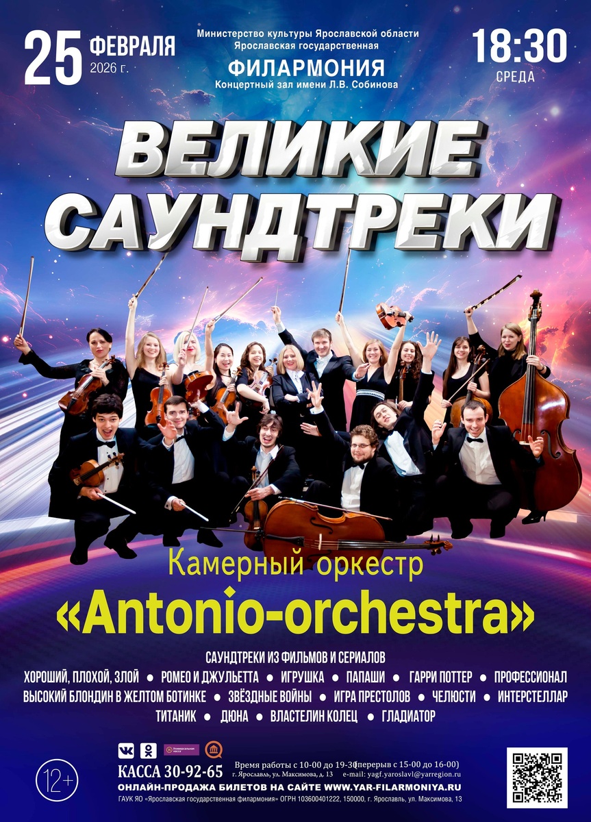 страницам мирового кино. Спешите 👉 https://yar-filarmoniya.ru/afisha/view.php?af_id=5963 👏👏👏 Камерный оркестр «Antonio-orchestra» (Москва) подарит вам возможность вновь пережить любимые моменты из культовых фильмов и сериалов. Оживут легендарные мелодии, которые навсегда вошли в историю: космические просторы «Звездных войн» и эпичность битв «Властелина колец», таинственные мотивы «Игры престолов» и завораживающая атмосфера «Дюны», трогательные мелодии «Титаника» и шекспировской драмы «Ромео и Джульетты». Дерзкие темы из вестернов, таких как «Хороший, плохой, злой», пронзительные мотивы «Профессионала» и героический дух «Гладиатора». А как же без волшебства Хогвартса под звуки «Гарри Поттера»? Щепотку юмора из «Игрушки» и «Папаш», напряжение от «Челюстей» и бесконечность космоса с «Интерстелларом». Не упустите шанс погрузиться в атмосферу любимых кинол Показать полностью...