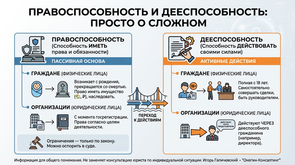 Привет! Меня зовут Галичевский Игорь, основатель юридической компании "Онегин-Консалтинг", адвокат и действующий арбитражный управляющий. В этой статье я расскажу вам о правоспособности и дееспособности. Для дальнейшего понимания написанного, полезно знать немного теории. Все субъекты в гражданском праве делятся на физических и юридических лиц. У каждого из них есть своя правоспособность. Разберемся подробнее. Сначала то, что касается правоспособности граждан. П.1 ст.17 ГК РФ (ч.1): «Способность иметь гражданские права и нести обязанности (гражданская правоспособность) признается в равной мере за всеми гражданами». Это и есть правоспособность, которая возникает в момент рождения гражданина и прекращается с его смертью. Содержание правоспособность описано в ст.18 ГК РФ (ч.1) и включает в себя возможность иметь имущество на праве собственности, наследовать и завещать имущество; заниматься предпринимательской и любой иной не запрещенной законом деятельностью и прочее. Теперь то, что касае