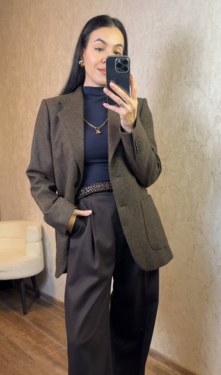 Составила костюм из жакета и брюк. Вещи продаются по отдельности. Этот жакет отлично смотрится и с любыми другими брюками в тон (пример на фото).