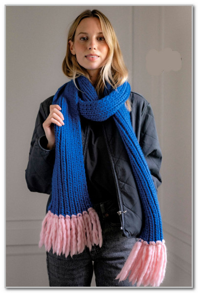 Перевод из журнала "Stickat & Sant" № 1, 2026 г. Ярко-синий и матово-розовый — это действительно красивые дополняюшие друг друга цвета. Классический шарф, в резинку, с уютными кисточками, вяжется очень быстро на спицах 9 мм.