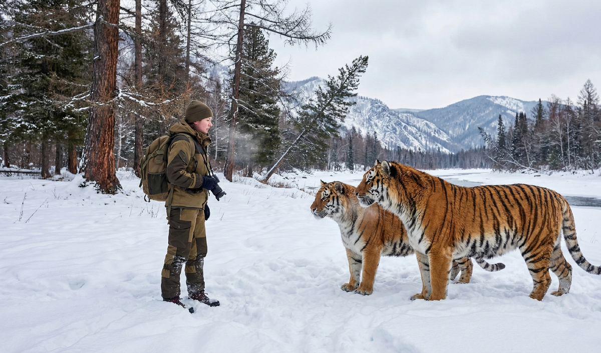 Тимофей замер как вкопанный. Он увидел картину, в которую городской житель никогда бы не поверил. Его внучка сидела под елью, живая, а вокруг неё, как стражи, стояли два огромных амурских тигра. Они смотрели на старика, и в их взгляде было узнавание.