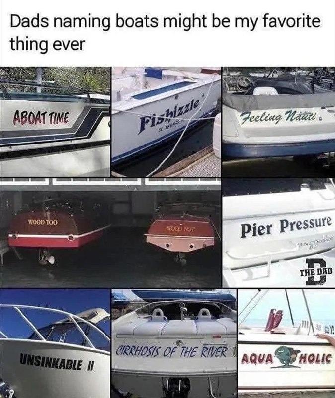 🚤 Сегодня наслаждаемся языковыми игрушками в остроумных названиях лодочек⤵️ ✅aboat time "Лодочный" вариант фразы "about time" - "давно пора/самое время". Есть еще фильм "About time", который перевели как "Бойфренд из будущего"😏 Точно кандидат для моей рубрики "трудности кино-перевода". ✅fishizzle "Рыбный" вариант слэнгового выражения "fo' shizzle" - па-любасу, конешн (в миру "for sure"). За суффикс -izzle, распространённый в языке подобно оспе, мы благодарим дядюшку Снуп Дога и его рэпесенки. ✅feeling nauti Тут микс слов "naughty" - "непослушный/озабоченный" и "nautical" - "мореходный". Так что хозяин лодки как-то себя чувствует, а как именно - кто знает🤗 ✅А вот тут я хз. Изгуглилась, издумалась, не пойму. Если кто сообразит в чем каламбур, буду максимально grateful. Только предполагаю игру слов из разряда " would too/ would not." - "Я б вдул/а я нет". Или типа "wood two/wood not" - "дерево два/дерево не два(а 1)". Лодки же две. В общем, help🙏 ✅pier pressure Рeer pressure (да