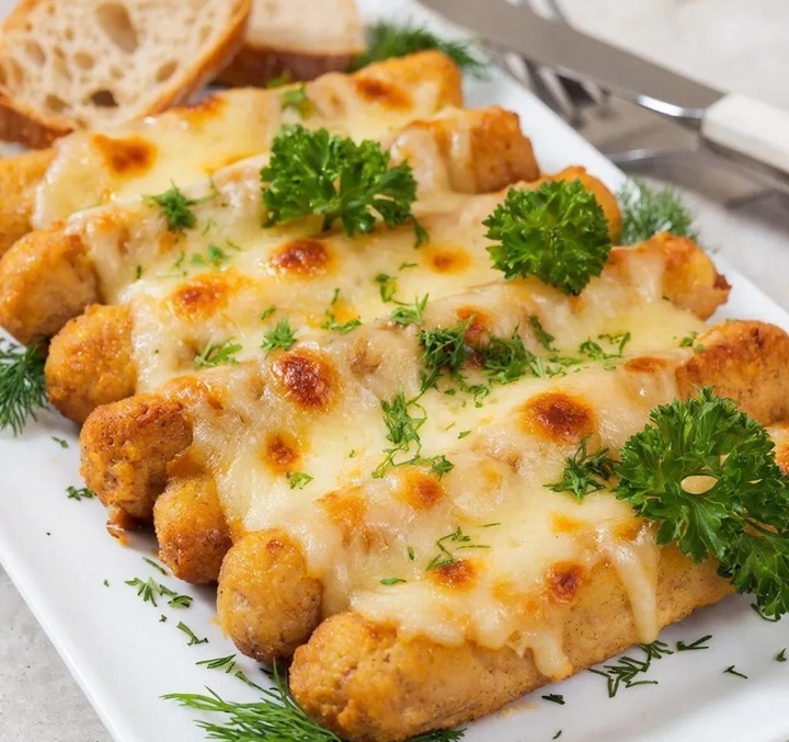 Противень застилаем бумагой для выпечки, выкладываем обжаренные изделия, посыпаем сверху натертым сыром и ставим в предварительно разогретую духовку до 180 градусов примерно на 10 минут, пока сыр не расплавится и не приобретёт аппетитную румяную корочку.