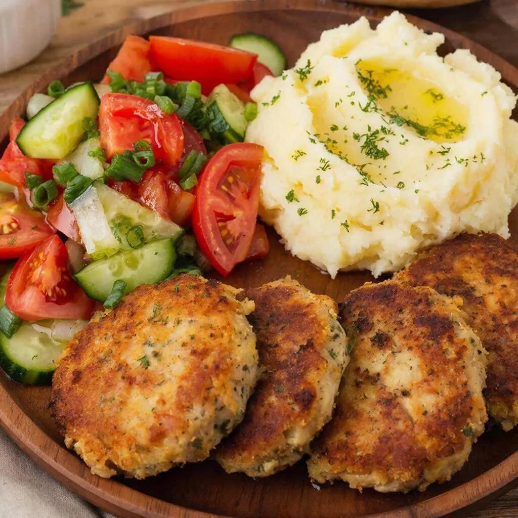 Приготовьте идеальный семейный ужин быстро и вкусно. Этот простой рецепт позволит насладиться сочными куриным котлеткам, нежнейшим картофельным пюре и легким овощным салатиком. Ваши близкие точно оценят такую заботу! Список ингредиентов: Куриные котлетки: - Филе куриной грудки — 500 г - Панировочные сухари — 1 стакан - Молоко — ½ стакана - Яйцо — 1 шт. - Соль, черный молотый перец — по вкусу - Растительное масло для жарки Картофельное пюре: - Картофель — 800 г - Масло сливочное — 50 г - Молоко теплое — 100 мл - Соль — по вкусу Овощной салат: - Огурцы свежие — 2 шт. - Помидор свежий — 1 большой - Зеленый лук — пучок - Лимонный сок — 1 столовая ложка - Оливковое масло — 2 столовые ложки - Соль и свежемолотый перец — по вкусу Рецепт приготовления: Котлетки из куриного филе 1. Приступим к подготовке фарша. Мелко порубите ножом или пропустите через мясорубку филе курицы. 2. Замочите панировочные сухари в молоке и смешайте с рубленым куриным филе. 3. Взбейте яйцо и соедините его с фаршем,