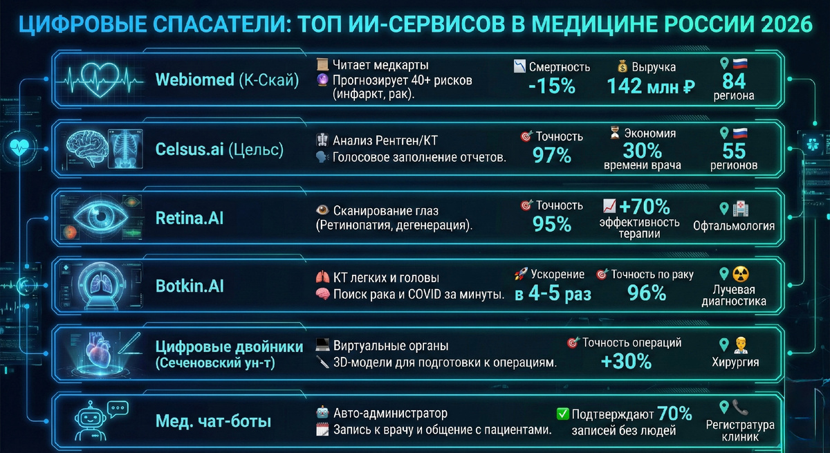 - Webiomed (К-Скай): Читает ЭМК, прогнозирует 40+ рисков (инфаркты, рак). Снижает смертность на 15%! В 84 регионах, 142 млн руб. выручки.