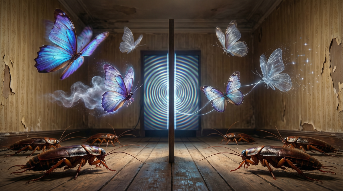 Таким образом, сам акт наблюдения — «проверки, где бабочка» — является тем самым грубым «измерением». В момент взаимодействия хрупкое состояние суперпозиции (быть везде) коллапсирует в один конкретный факт. Бабочка вынуждена «выбрать» одну точку в пространстве. Она не может одновременно оставаться неуловимым призраком и быть пойманным объектом — эти состояния взаимоисключающи.