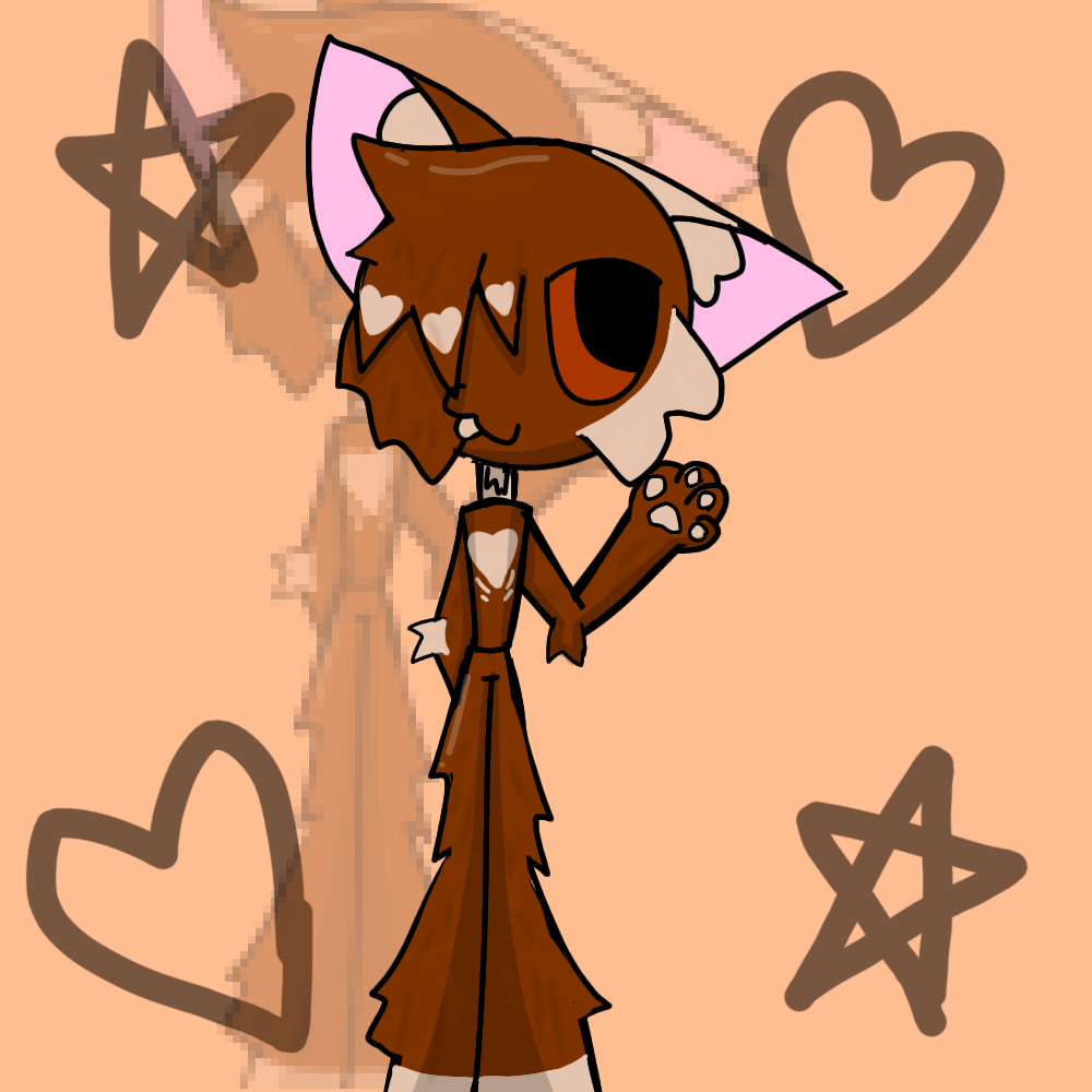 Коричневый котик, с бежевым сердечком на груди, есть чёлка и на ней тоже сердечки, бежевые и коричневые пушки на руках и голове, с бежевым и коричневым ушком, и с бежевыми пятнышками на конце задних лапок ^^!
