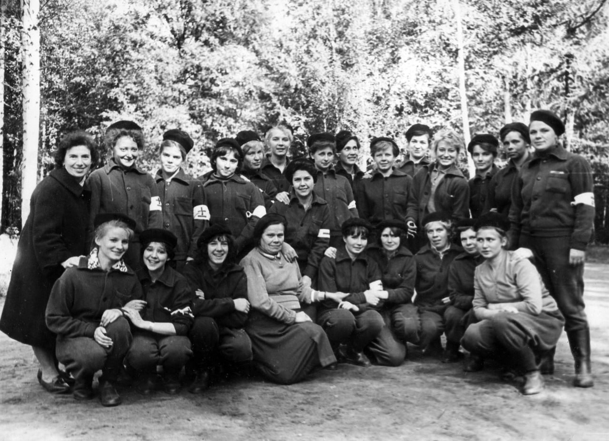 Девушки-бойцы гражданской обороны в куртках с брюками и беретах.