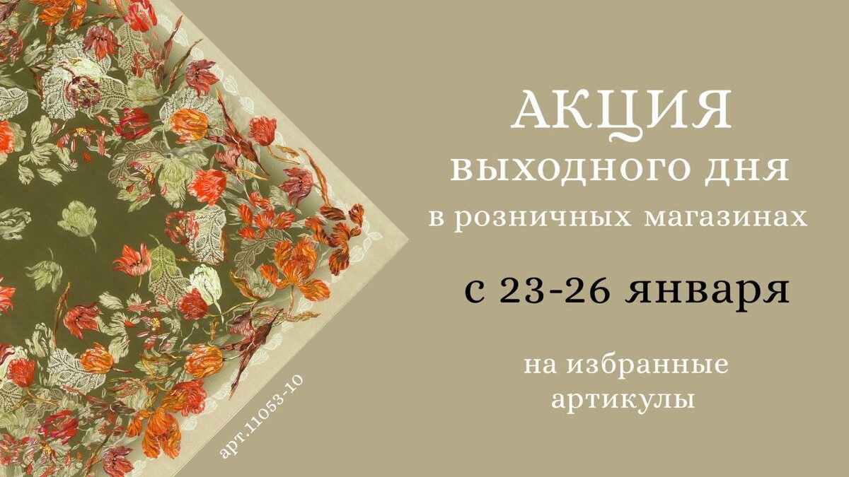 ! 💥 Уважаемые покупатели, приглашаем вас на специальную акцию выходного дня с 23 по 26 января, которая пройдёт в наших розничных магазинах сети. 📆 В эти дни мы дарим скидку до 30% на следующие артикулы: Платок «Северянка» Цена в магазине 3000 руб. Платок «Посиделки» Цена в магазине 550 руб. Платок «Восточные сладости» Цена в магазине 4390 руб. Платок «В лабиринте снов» Цена в магазине 2130 руб. Платок «10079» Цена в магазине 2130 руб. Платок «11053» Цена в магазине 2130 руб. Платок «11053» Цена в магазине 2130 руб. ❗️Напоминаем, что цены в интернет-магазине и розничных магазинах могут отличаться. ✔️Проведите выходные за приятным шопингом —> адреса розничных магазинов