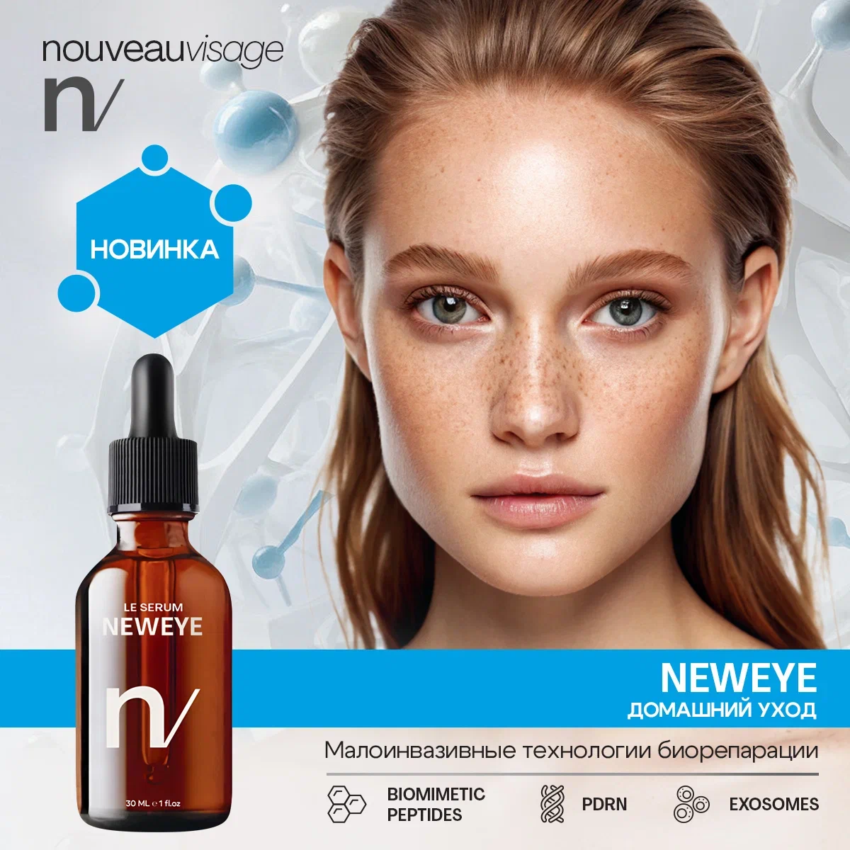 Если искать на лице «слабое звено», то это однозначно кожа вокруг глаз. Она тоньше, чем на щеках, почти лишена жировой прослойки, но при этом постоянно в движении — мы моргаем, щуримся, улыбаемся. Неудивительно, что именно здесь первыми появляются «гусиные лапки», темные круги и предательская отечность. Проблема не в том, что коже не хватает питания, а в том, что с возрастом разрушается ее внутренний каркас — волокна коллагена и эластина. Представьте старый матрас: вы можете менять наматрасник (поверхностный уход), но если пружины сломаны, он все равно будет провисать. Так и здесь: чтобы вернуть коже упругость, нужно «починить» ее структуру изнутри. Именно для этого был создан комплекс NEWDERM EYE и LE SERUM NEWEYE от Nouveau Visage. 1. Запуск собственной «фабрики» коллагена.