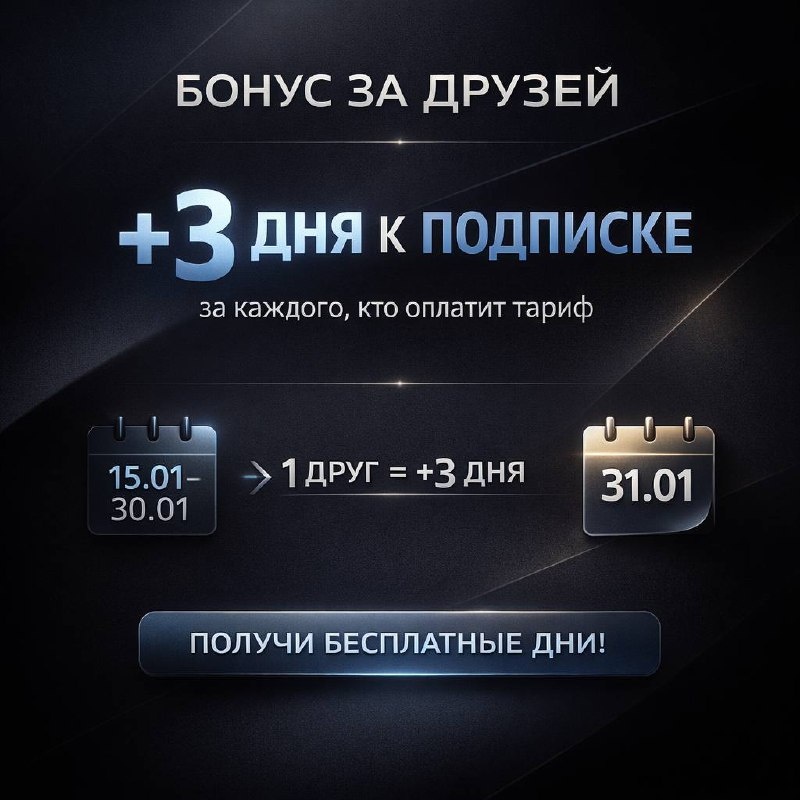 🙌 Получай +3 дня к подписке за каждого друга, который оплатит любой тариф по твоей ссылке. ⏰ Сроки: 🟢 15.01 - 30.01 📌 Бонусные дни добавим 31.01 👇 Как это работает: 1️⃣ Зайди в «Пригласить друзей» 2️⃣ Скопируй свою ссылку 3️⃣ Отправь друзьям 4️⃣ Друг оплатил → тебе +3 дня 💡 Пример: 10 оплативших друзей = +30 дней к подписке ⚠️ На момент начисления у тебя должна быть активная подписка (Стандарт / Премиум / VIP) 🚀 Начни использовать мощный VPN