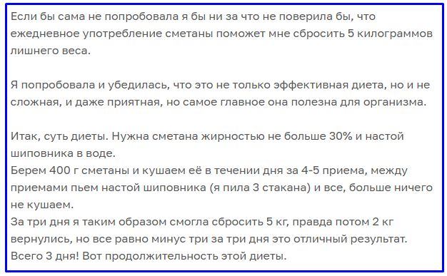 Подписчица похудела на сметане за несколько дней, сразу минус несколько килограмм. Подтянулась кожа и стала выглядеть моложе и вот её история моментального похудения без голода и срывов... Более того как выяснилось ей удалось улучшить работу ЖКТ и вывести лишнюю жидкость из организма, т.к. часто с утра были отёки. Сметана может помочь вам сбросить вес, поскольку является полезным источником белка, который снижает тягу к еде и поддерживает высокий уровень метаболизма. Это отличный продукт для похудения, поскольку он богат витаминами и минералами, в том числе кальцием, калием и витамином А, которые важны для здоровья и снижения веса. Показания к сметанной диете. Сметана — это молочный продукт, получаемый путём добавления молочнокислых бактерий в сливки. Она содержит много жира, но является источником полезных жиров. Сметана веками использовалась в кулинарии и имеет пикантную кремовую консистенцию. Сметана также богата мононенасыщенными и полиненасыщенными жирами, которые считаются самыми