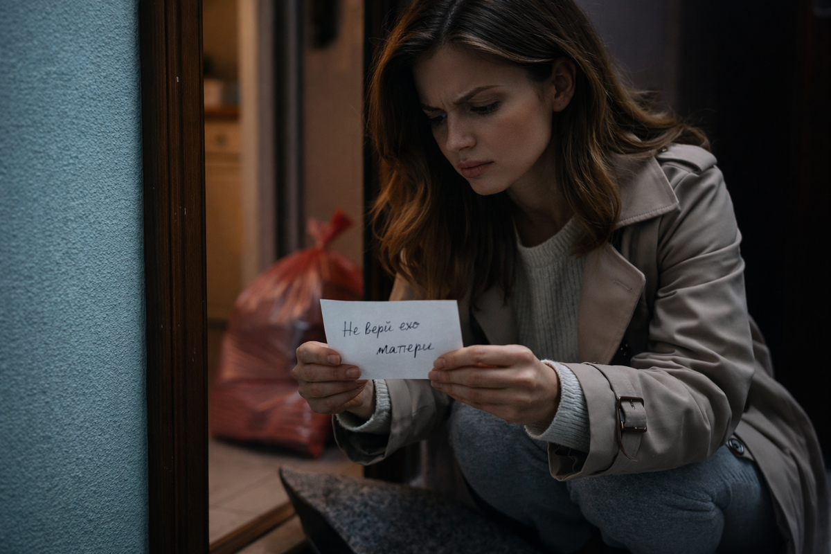 Я вышла из квартиры вынести мусор. Без макияжа, в домашнем свитере, с тем самым лицом “я не проснулась, но уже устала”. На лестничной клетке пахло подъездом: чьими-то котлетами, дешёвым освежителем воздуха и холодом. Я подняла коврик у двери — потому что он всё время съезжал и цеплялся за носки — и увидела белый сложенный прямоугольник бумаги.