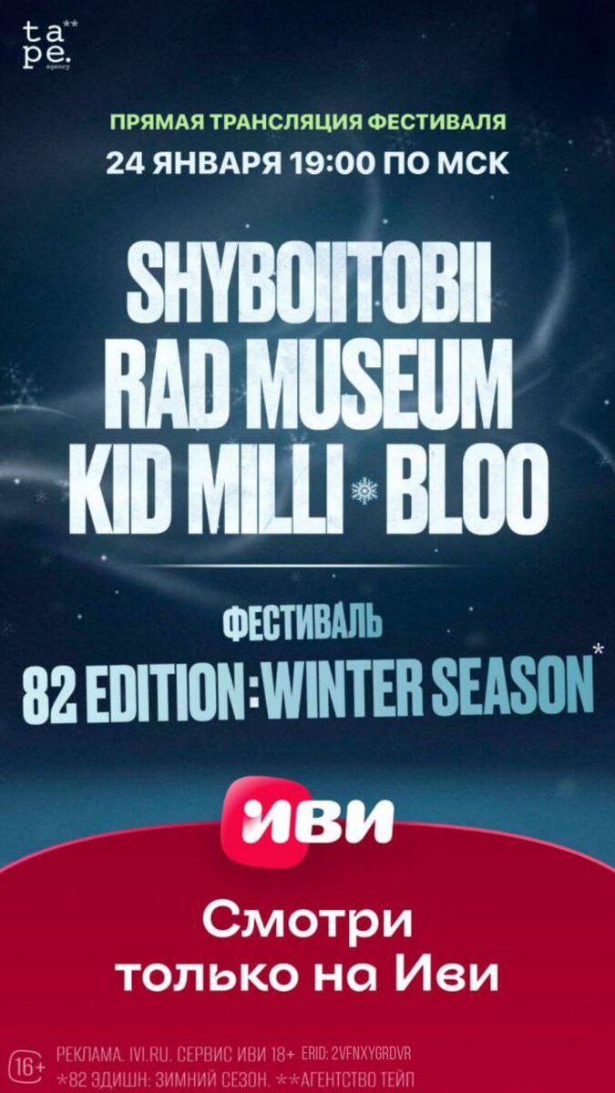 : ✨ Сегодня в 20:00 — прямой эфир концерта W24. Ребята выступят в Москве в рамках тура «Трава у дома» и порадуют нас не только своими хитами, но и каверами на популярные русские треки. Делаем ставки: какие песни попадут в сетлист? ✨24 января — трансляция фестиваля 82 EDITION: Winter Season. Лайнап — отвал всего: KID MILLI, RAD MUSEUM, BLOO и SHYBOIITOBII. Говорят, что на фесте мы услышим совместные треки KID MILLI и RAD MUSEUM, так что подключаемся в 19:00 и ждём. Если у тебя нет подписки, просто активируй промокод NEW26, чтобы ничего не пропустить. И подключайся к обсуждениям в канале Иви Дорамы, Аниме, k-pop. Условия