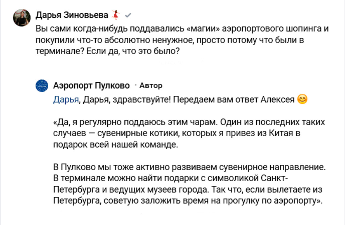 На прошлой неделе мы предложили задать вопросы Алексею Тесло-Данилову, директору по неавиационной коммерции аэропорта Пулково. Мы обещали, что автор самого интересного вопроса первым получит худи из нашей новой лимитированной коллекции. Наш выбор пал на вопрос Дарьи Зиновьевой. А на вас тоже действует аэропортовая магия? ✨ Поздравляем Дарью и благодарим всех за участие! Следите за новостями: впереди еще конкурсы и новые проекты.