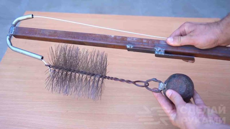 В данном обзоре расскажем и покажем, как сделать простое и удобное в использовании приспособление, предназначенное для чистки дымохода в частном доме, на даче или в гараже. Для изготовления этой самоделки нам потребуется кусок профильной трубы, часть гантели, металлический ершик, отрезок трубки и стальной тросик. Первым делом отрезаем часть гантели. Потом привариваем к ней половину кольца из металлической трубы. Далее крепим к «грузилу» металлический ершик. Для этого можно использовать звено цепи или сделать звено из куска проволоки. На следующем этапе отрезаем кусок профильной трубы и привариваем к нему кусок круглой металлической трубки. Однако предварительно её нужно согнуть, как показано на фото ниже. Далее отрезаем две заготовки из металлической полосы, вставляем между ними небольшой кусок металла аналогичной толщины, и обвариваем. Получившуюся деталь привариваем к профтрубе. Через круглую трубку пропускаем стальной тросик нужной длины. Один край крепим к ершику. Ну вот и всё. Наш