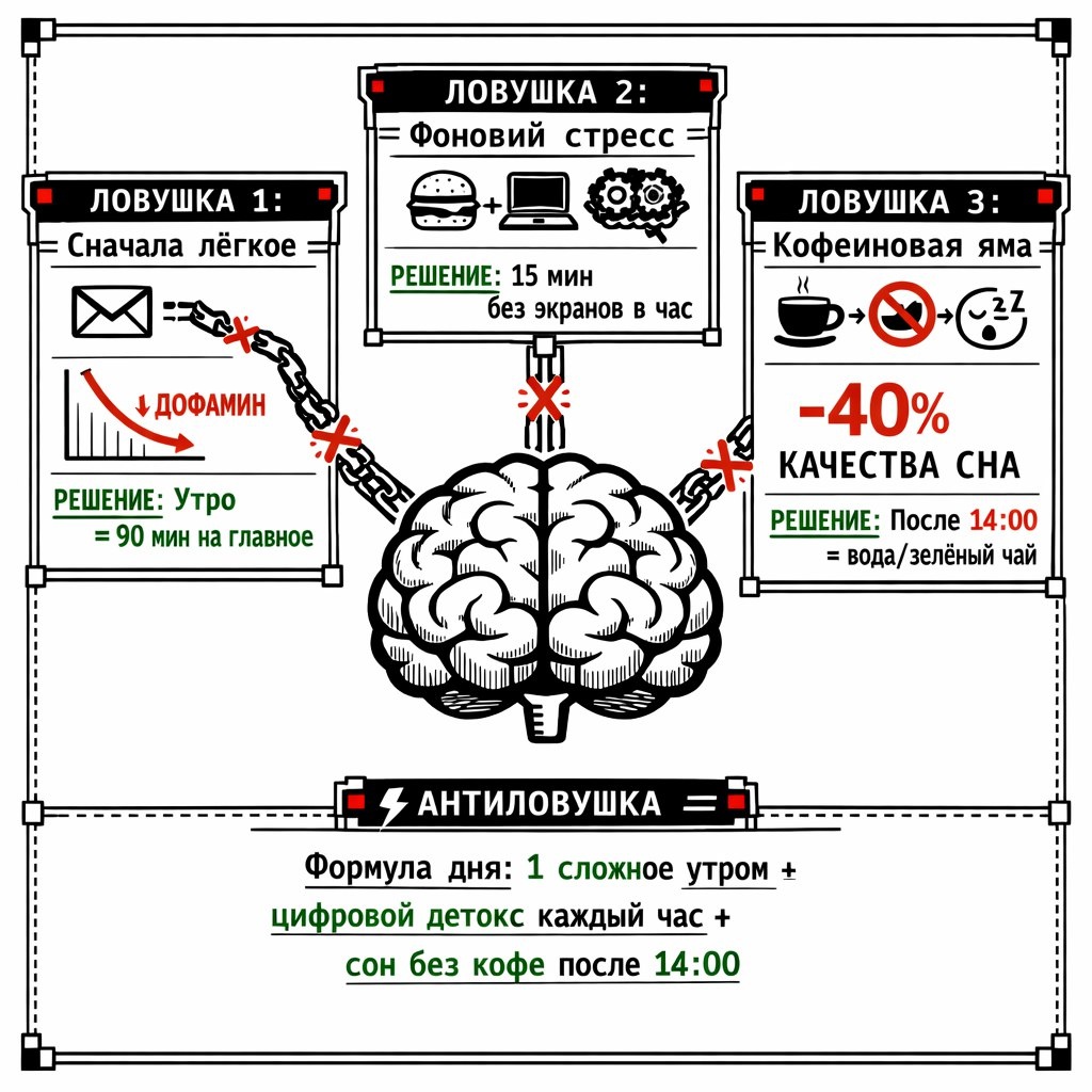 Это не ваша вина. Ваш мозг саботирует вашу эффективность через 3 скрытые ловушки. Разберём каждую.