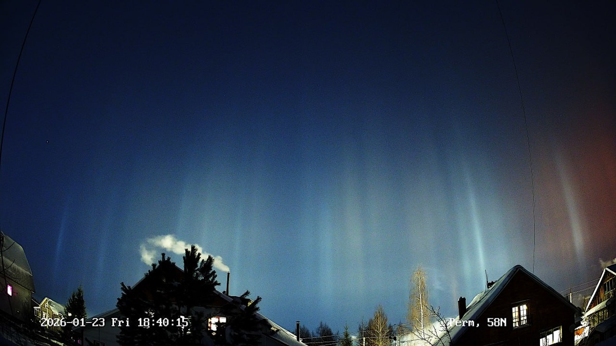 Световые столбы морозным вечером 23 января 2026 года
