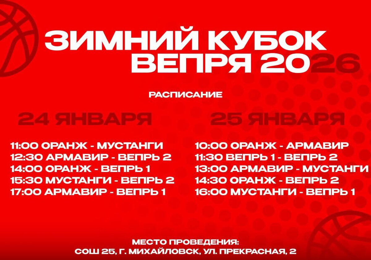 🏆 В эти выходные в г. Михайловске состоится турнир среди юношей 2011-12 г.р. Сразу две команды БК Вепрь у себя дома будут принимать гостей из Ставрополя и Армавира. 🧐 Если вы ещё не знаете, как провести субботу и воскресенье, то мы подскажем: г. Михайловск, ул. Прекрасная 2, СОШ №25 Приходи и зарядись атмосферой красивого баскетбола! ✨ Ждём всех! #михайловск ------------------------ 🔔Подписывайся на новости Михайловска в: 📲 MAX | 💬 Тelegram ------------------------ 📝 Прислать новость