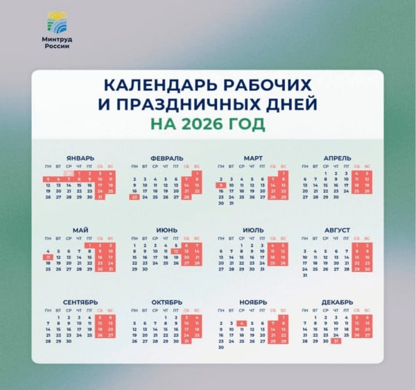 Министерство труда Российской Федерации подготовило проект производственного календаря на 2026 год. Документ утверждён постановлением Правительство Российской Федерации от 24 сентября 2025 года № 1466 с учётом переноса выходных дней. При пятидневной рабочей неделе в 2026 году установлено: - 247 рабочих дней - 118 выходных и нерабочих праздничных дней Производственный календарь поможет работодателям и сотрудникам заранее спланировать рабочие графики, отпуска и нагрузку в течение года. Источник: https://www.pro-goszakaz.ru/article/104634-proizvodstvennyy-kalendar-na-2026-god