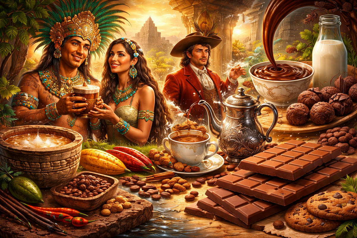 Представьте себе мир без шоколада: без плитки, тающей во рту после трудного дня, без праздничных конфет, без горячего какао в зимний вечер. Это кажется почти невозможным. Но путь шоколада к нашей полке в магазине был долгим, полным превращений и удивительных открытий. Его история началась не на кондитерской фабрике, а в душных тропических лесах Центральной Америки, где он почитался как дар богов. Всё началось с дерева какао (Theobroma cacao), название которого с греческого переводится как «пища богов». Первыми, кто оценил потенциал его бобов, были древние народы Мезоамерики — ольмеки, майя, а позже ацтеки. Для ацтеков шоколад был не лакомством, а ритуальным, элитарным и даже лечебным напитком. Его готовили холодным и горьким. Обжаренные какао-бобы растирали в пасту, смешивали с водой, перцем чили, ванилью, кукурузной мукой и иногда солью. Получался густой, пенистый напиток с острым вкусом — xocolātl (отсюда и название «шоколад»), что значит «горькая вода». Шоколад служил церемониальным