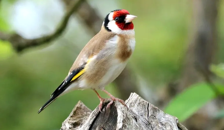 Голова: Самая яркая часть щегла – это его "шапочка". У взрослых птиц она ярко-красная, с черными перьями, обрамляющими клюв и глаза. Эта красная "маска" придает щеглу очень выразительный и даже немного озорной вид.