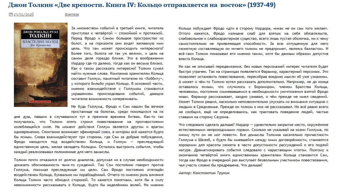 Джон Толкин «Две крепости. Книга IV: Кольцо отправляется на восток» Критика